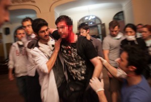 Burada yaralının durumu tespit ediliyor ve önce cami girişindeki ayakkabılık bölümünde, sonraları yoğun gaz nedeniyle kaçınılmaz olarak caminin içinde olan ‘acil müdahale noktası’na alınıp alınmayacağına karar veriliyor. Pek çok kişi (özellikle gazdan etkilenenler) burada ayaküstü müdahalelerle gönderiliyor. Durumu daha ciddi olanlar, çoğunlukla metal polis barikatlarından bozma ‘sedye’lerle içeri taşınıyor. Ayakkabılık önünde, yani caminin girişinde dört kişilik bir ekip, ayakta ya da sedyede gelmekte olan yaralının ayakkabılarını çıkarıyor. Evet, camide dört kişi uzunca bir süre ‘ayakkabı çıkarmaktan sorumlu’ olarak çalışıyor. Sonra yaralı içeri alınıyor ve yarasının mahiyetine göre, acil, ortopedi, cerrahi gibi ‘polikliniklere’ ayrışmaya başlamış olan köşelerden birine taşınıyor.