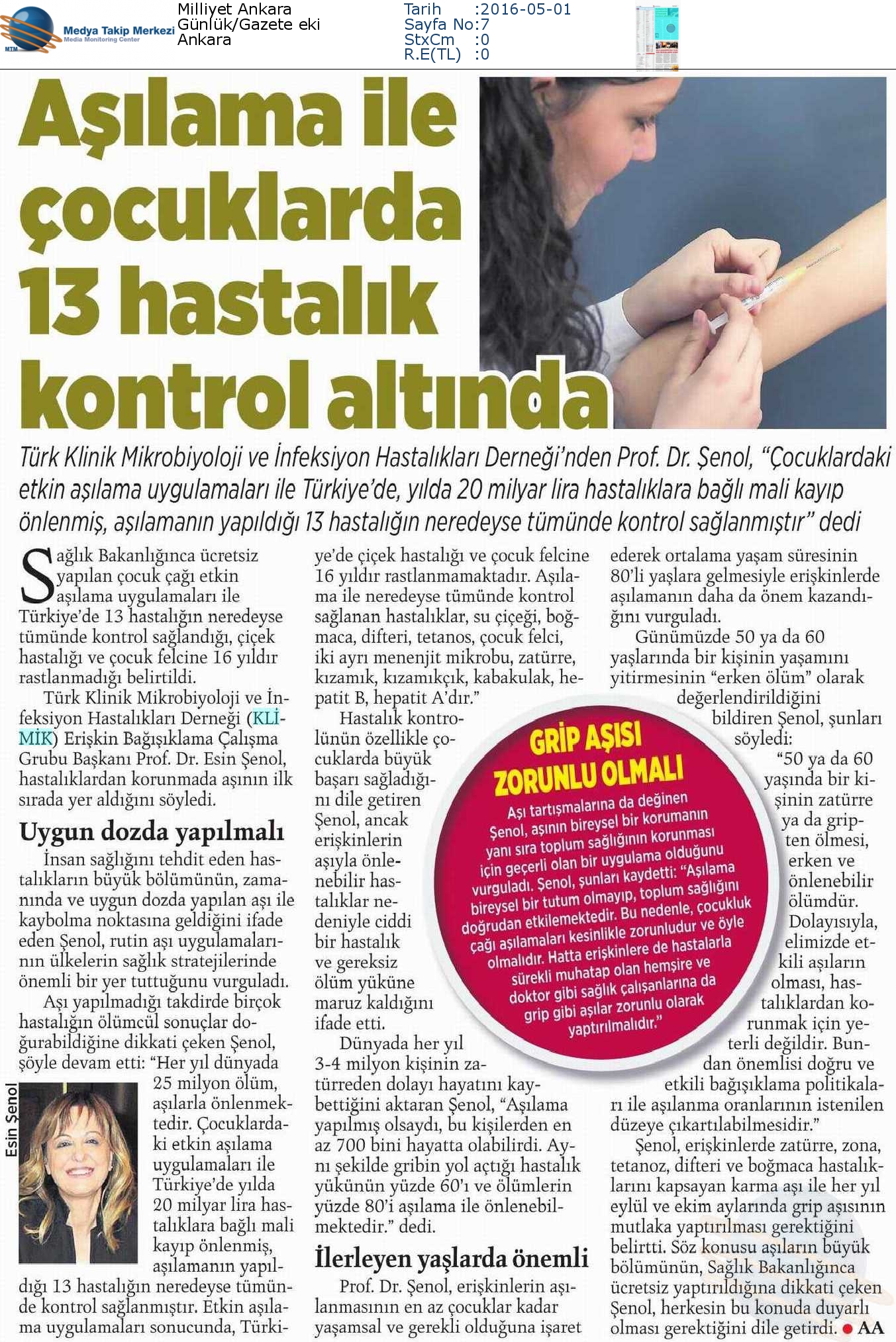 KLİMİK (Türk Klinik Mikrobiyoloji ve İnfeksiyon Hastalıkları Derneği ) Erişkin Bağışıklama Çalışma Grubu Başkanı Prof. Dr. Esin Şenol, 20’nci yüzyılın ikinci yarısında insan sağlığını tehdit eden pek çok hastalığın aşılar sayesinde artık neredeyse kaybolma noktasına geldiğini vurguladı. Prof. Dr. Şenol, “Çocuk hastalıklarının kontrolünde elde edilen büyük başarılara rağmen, erişkinlerdeki sorun sürüyor. Aşıyla önlenebilir hastalıklar nedeniyle ciddi bir hastalık ve gereksiz ölüm yükü var” dedi.