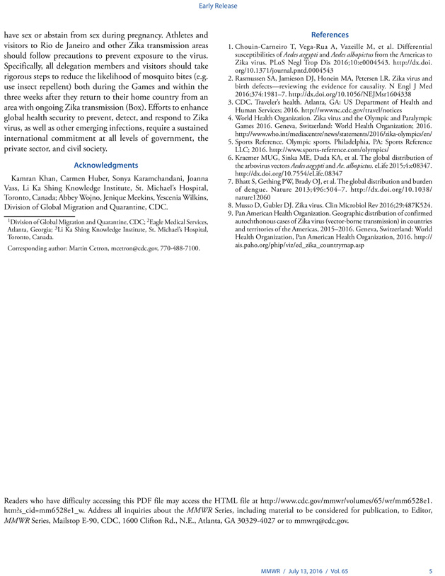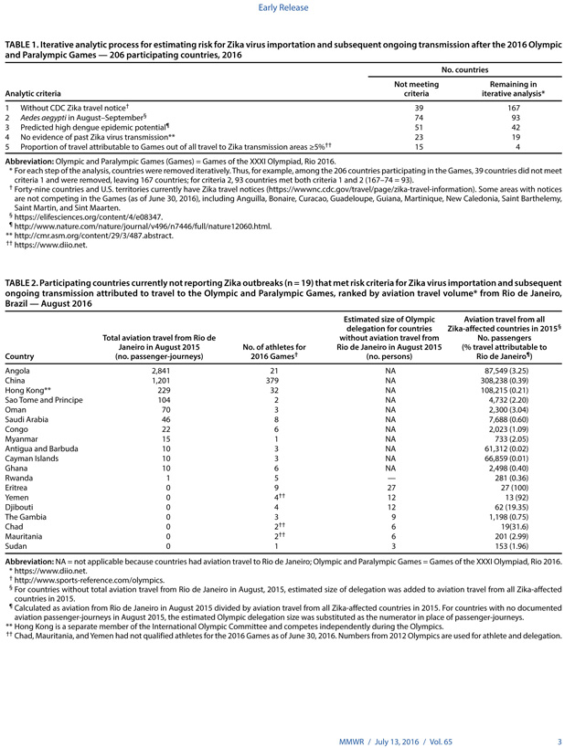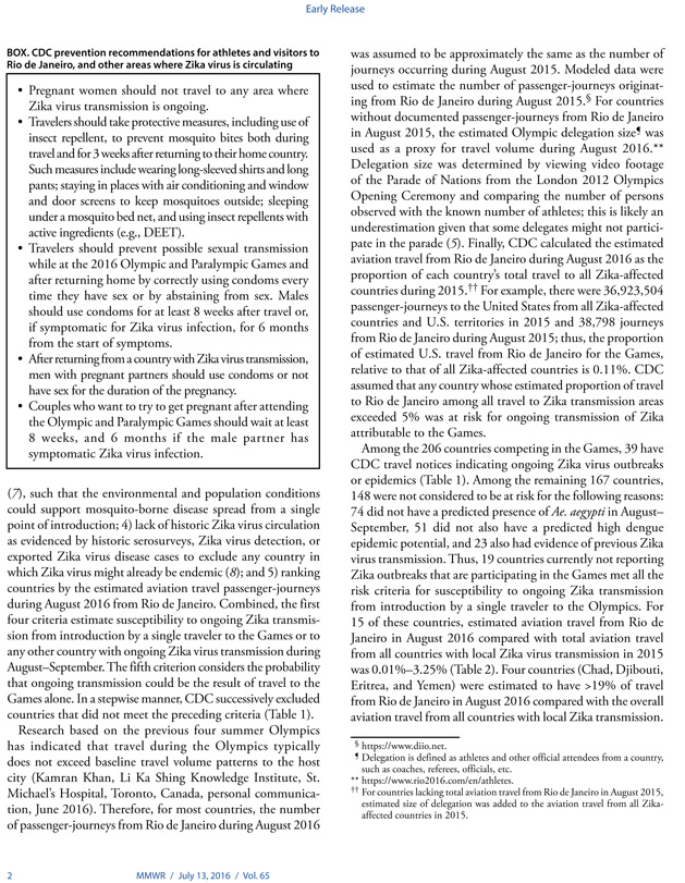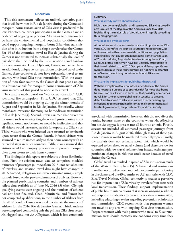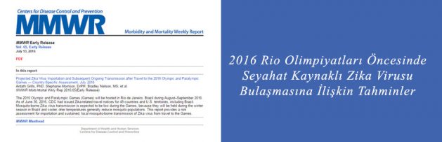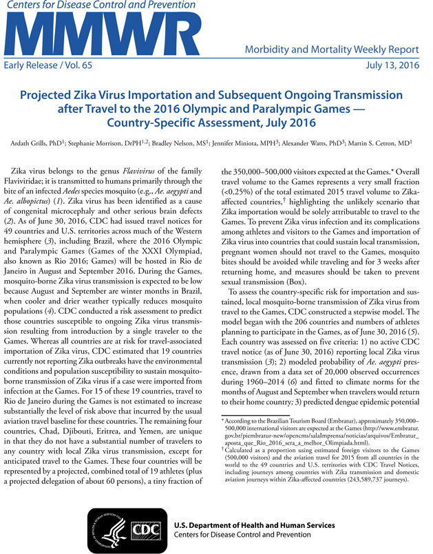 MMWR, 2016 Rio Olimpiyatları ve Paralimpik Oyunları öncesinde Zika virusu bulaşmasına ilişkin erken baskı yaptı. 2016 Rio Olimpiyatları ve Paralimpik Oyunları için Rio de Janeiro’ya 207 ülkeden 350 000-500 000 arasında uluslararası ziyaretçinin akın etmesi bekleniyor. Güney Amerika’ya artan seyahat oranı, ülkeler arasında Zika virusunun taşınması riskini de beraberinde getiriyor. CDC, şimdiye dek Zika salgını bildirilmeyen ancak Ağustos-Eylül ayları arasında sivrisinek kaynaklı Zika virusu geçişine imkan tanıyabilecek çevre ve nüfus özelliklerine sahip 19 ülkeyi belirledi. CDC’nin analizi, Çad, Cibuti, Eritre ve Yemen’in seyahat kaynaklı Zika virusu riskinin daha yüksek olduğunu ortaya koyuyor. Olimpiyatlar kış aylarında düzenleneceği için ziyaretçilerin sivrisinek kaynaklı Zika infeksiyonlarına yakalanma riski düşük görünüyor. Hamile kadınların Olimpiyatların düzenlendiği bölgeye seyahat etmemesi, tüm ziyaretçilerin sivrisinek ısırıklarına karşı seyahatleri ve sonraki üç hafta boyunca tedbir alması ve cinsel yolla bulaşmaya karşı da dikkatli olması tavsiye ediliyor.
