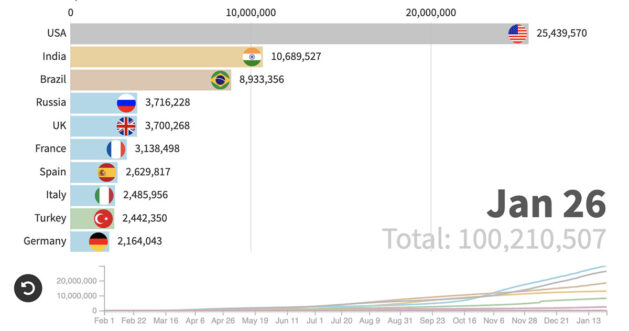 Johns Hopkins Üniversitesi tarafından derlenen verilere göre, şu anda dünya çapında 100 milyondan fazla insana COVID-19 bulaştı.