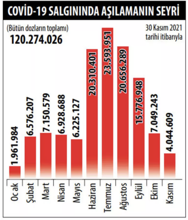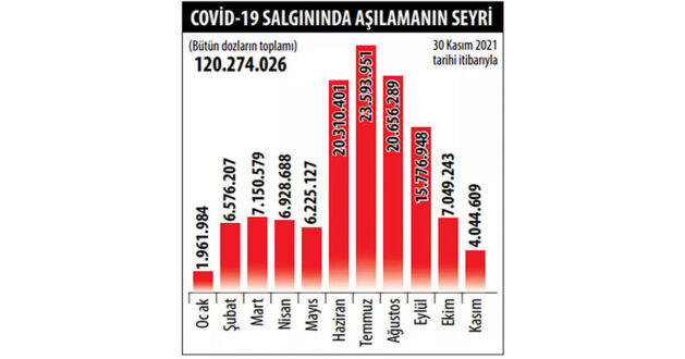 Sağlık Bakanlığı’nın verilerine bakılırsa dün sabah itibarıyla toplam 121 milyon 666 bin doz aşı yapılmıştı. Birinci doz aşı uygulananların sayısı 56.5 milyonu geçerken, ikinci doz uygulananların sayısı 50.9 milyona yaklaşmıştı. Hatırlatma dozlarının toplamı ise 14.2 milyonu geçmişti.