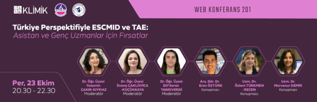 23 Ekim 2025 Perşembe günü 20.30-22.00 saatleri arasında “Türkiye Perspektifiyle ESCMID ve TAE: Asistan ve Genç Uzmanlar İçin Fırsatlar” Web konferansı yapılacaktır.