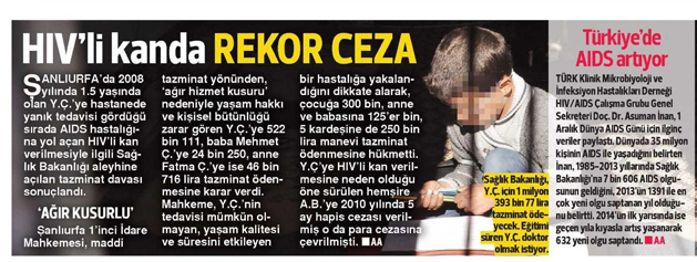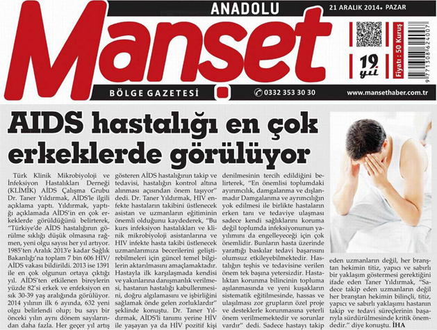 Türk Klinik Mikrobiyoloji ve İnfeksiyon Hastalıkları Derneği (KLİMİK) AİDS Çalışma Grubu Başkanı Dr. Taner Yıldırmak, AİDS’le ilgili açıklama yaptı. Yıldırmak, yaptığı açıklamada AİDS’in en çok erkeklerde görüldüğünü belirterek, “Türkiye’de AİDS hastalığının görülme sıklığı düşük olmasına rağmen, yeni olgu sayısı her yıl artıyor. 1985’ten Aralık 2013’e kadar Sağlık Bakanlığı’na toplam 7 bin 606 HIV/AİDS vakası bildirildi. 2013 ise 1391 ile en çok olgunun ortaya çıktığı yıl. AİDS’ten etkilenen bireylerin yüzde 82’si erkek ve enfeksiyon en sık 30-39 yaş aralığında görülüyor. 2014 yılının ilk 6 ayında, 632 yeni olgu belirlendi olup; bu sayı bir önceki yılın aynı dönem sayılarından daha fazla. Her geçer yıl artış gösteren AİDS hastalığının takip ve tedavisi, hastalığın kontrol altına alınması açısından önem taşıyor” dedi.