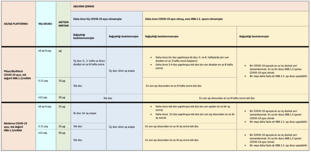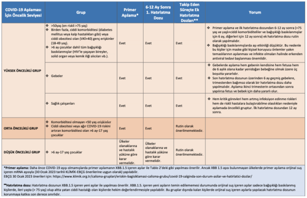 Yeni XBB.1.5. aşısıyla primer bağışıklamanın, bağışıklığı baskılanmışlar ve ≥6 ay-4 yaş arası çocuklar dışında tek doz olarak yapılması önerilmektedir (Tablo 2).