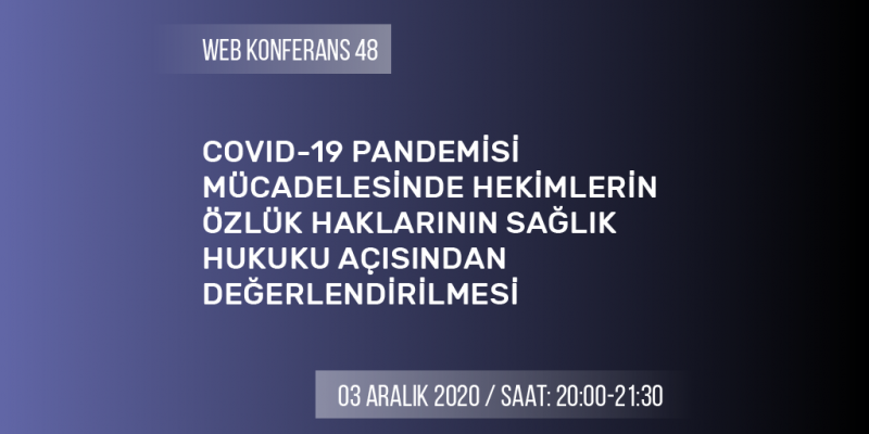 3 Aralık 2020 Perşembe günü, 20.00-21.30 saatleri arasında “COVID-19 Pandemisi Mücadelesinde Hekimlerin Özlük Haklarının Sağlık Hukuku Açısından Değerlendirilmesi” konulu web konferans yapılacaktır.