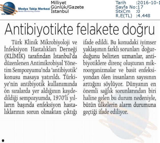 Türk Klinik Mikrobiyoloji ve İnfeksiyon Hastalıkları (KLİMİK) Derneği’nce İstanbul’da düzenlenen Antimikrobiyal Yönetim Simpozyumu’nda (6-8 Ekim 2016), Türkiye’den ve dünyadan infeksiyon uzmanları “antibiyotik direnci” konusunu masaya yatırdı.