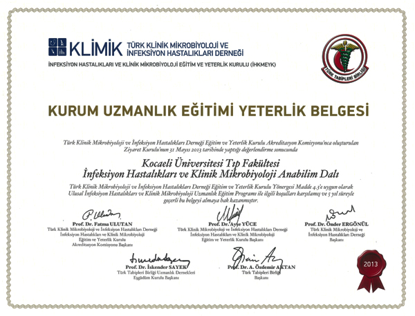 Kurum Uzmanlık Eğitimi Yeterlik Belgesi, 20 Eylül 2013’te Kocaeli Üniversitesi Tıp Fakültesi’nde yapılan ve Rektör Yardımcısı Prof. Dr. Ayşe Sevim Gökalp ile Dekan Yardımcısı Prof. Dr. İlhan Tarkun’un da katıldığı törenle, İHKMEYK Başkanı Prof. Dr. Ayşe Yüce tarafından İnfeksiyon Hastalıkları ve Klinik Mikrobiyoloji Anabilim Dalı Başkanı Prof. Dr. Birsen Mutlu’ya sunulmuştur.